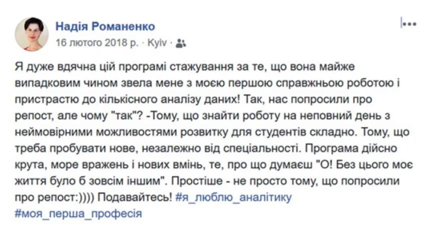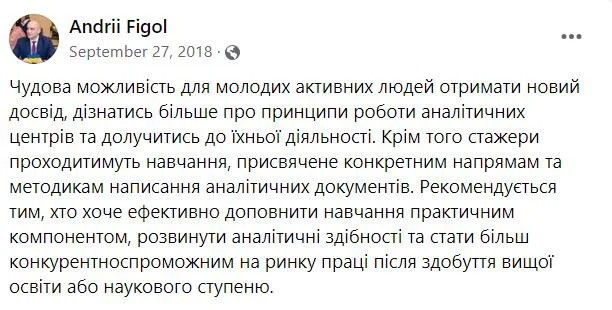 Взяти участь у стажуванні могли бути магістри, аспіранти та нещодавні випускники університетів не старше 35 років, які зацікавлені в аналітичних дослідженнях і прагнуть працювати у аналітичних центрах.